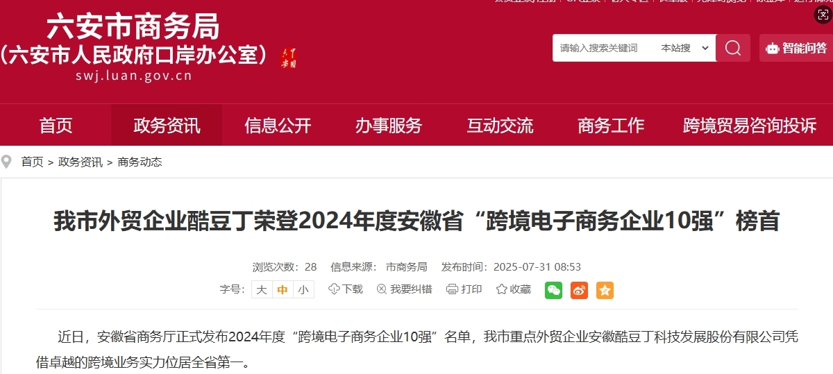 近日,安徽省商務(wù)廳正式發(fā)布2024年度“跨境電子商務(wù)企業(yè)10強(qiáng)”名單,我市重點(diǎn)外貿(mào)企業(yè)安徽酷豆丁科技發(fā)展股份有限公司憑借卓越的跨境業(yè)務(wù)實(shí)力位居全省第一。