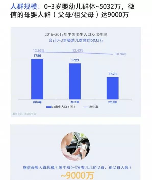 1、人群規(guī)模:0-3歲嬰幼兒群體~5032萬(wàn),微信的母嬰人群(父母/祖父母)達(dá)9000萬(wàn)。
