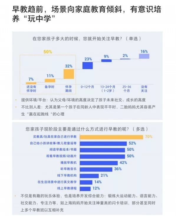4、對(duì)早教較為重視,場(chǎng)景化早教向家庭教育傾斜,有意識(shí)培養(yǎng)玩“玩中學(xué)”。