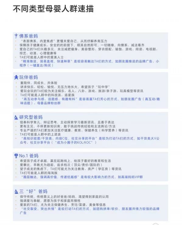 ·育兒方式更多元,愛(ài)自己的佛系爸媽、愛(ài)玩會(huì)玩的玩伴爸媽、專業(yè)嚴(yán)謹(jǐn)?shù)难芯啃桶謰?,成才卓越的No.1爸媽、愛(ài)家奉獻(xiàn)的三“好”爸媽…針對(duì)不同細(xì)分群體的精準(zhǔn)營(yíng)銷尤為重要