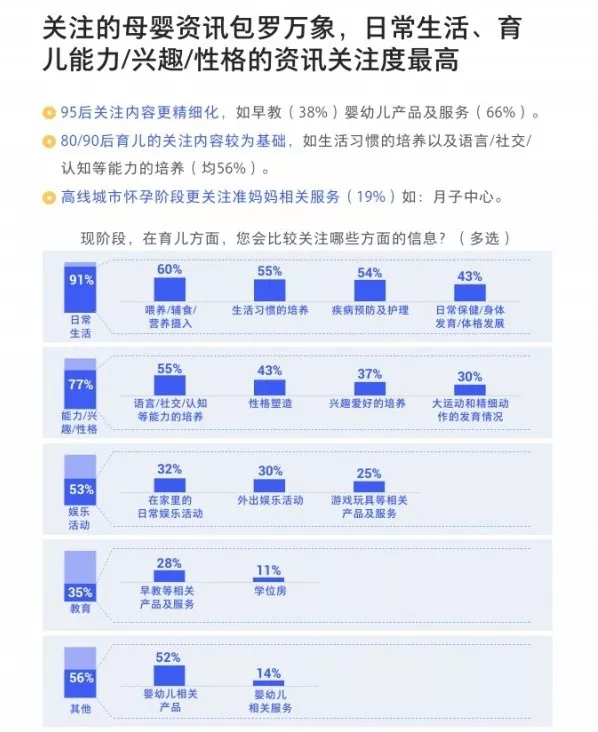·95后關(guān)注內(nèi)容更精細(xì)化,如早教(38%)嬰幼兒產(chǎn)品及服務(wù)(66%)。