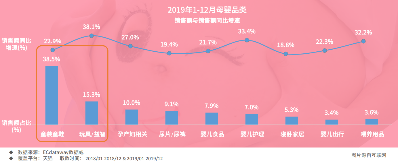從細(xì)分品類來看,2019年母嬰品類中童裝童鞋規(guī)模最大,占銷售額近40%;其次是玩具益智類,同比增速最快,達(dá)38.1%;童鞋童鞋品類同比增速雖然低一點(diǎn),只有22.9%,但也高于尿布、寢臥家居、嬰兒出行等這些品類。所以相對(duì)來說童裝和玩具/益智類目整體表現(xiàn)更好一些,尤其是玩具/益智類目最近幾年的增速一直都比較快。