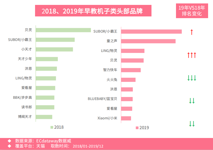 從2018、2019年的榜單對(duì)比來看,仍然停留在榜單的就是小霸王、物靈、貝靈(下滑到第4名),其他品牌基本上全部被換掉。同時(shí)也新增了一些品牌比如火火兔,還有小米,它也滲透了這個(gè)品類里來,并且已經(jīng)進(jìn)到前10名。整個(gè)市場(chǎng)格局還沒有完全穩(wěn)定,所以接下來整個(gè)市場(chǎng)還會(huì)有比較大的變化,應(yīng)該還會(huì)有越來越多的品牌,一方面是教育類的品牌,一方面是像小米類似這樣的生態(tài)品牌,慢慢滲透到這個(gè)品類中。