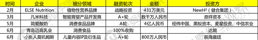 其中,在食品類目,今年2月,健合集團NewH2創(chuàng)新基金宣布對新型植物性營養(yǎng)品牌 Else Nutrition進行 575 萬加元的戰(zhàn)略性投資,后者所主張的基于植物的、非大豆的配方是一種純凈成分,為對配方奶粉不耐受的嬰幼兒和選擇純素家庭帶來更多選擇。此外,以高知媽媽群體為主力用戶人群的簡愛酸奶,在今年5月宣布完成4億人民幣A輪融資,據(jù)了解,簡愛創(chuàng)始團隊的爸爸們與3000個家庭共同參與了父愛配方系列酸奶的研發(fā),從營養(yǎng)品質(zhì)、用戶體驗到口味、包裝,積極提出反饋意見,致力于打造真正符合媽媽和寶寶需求的酸奶。