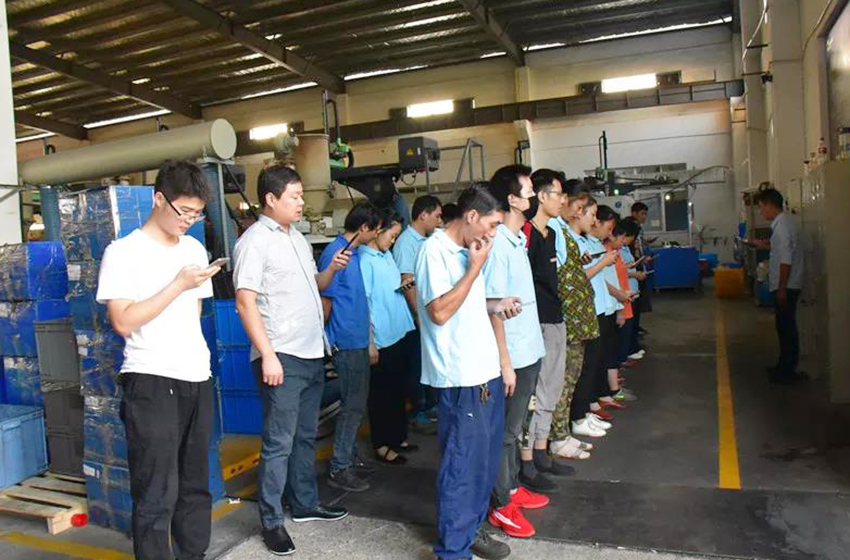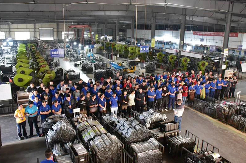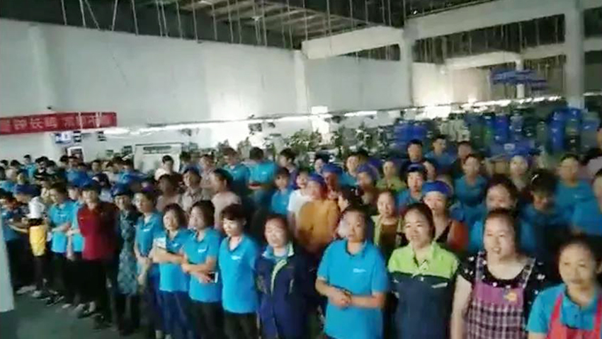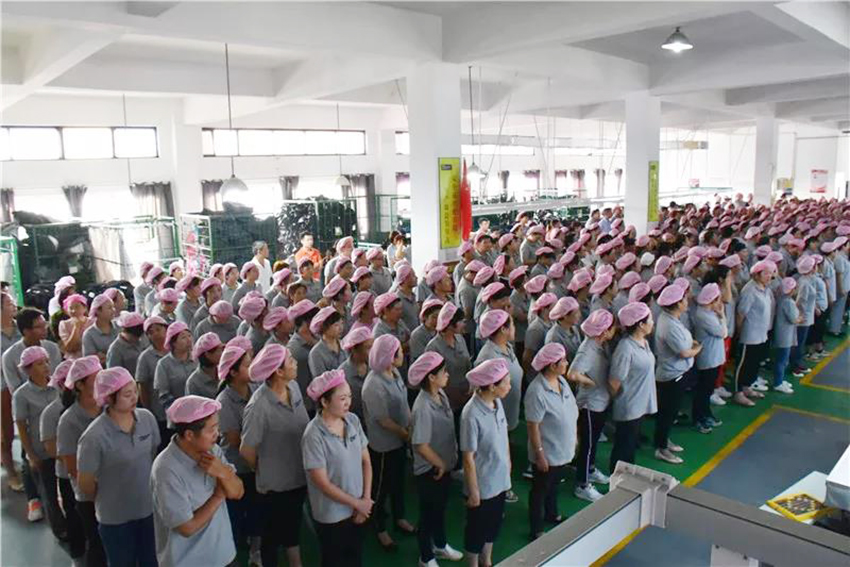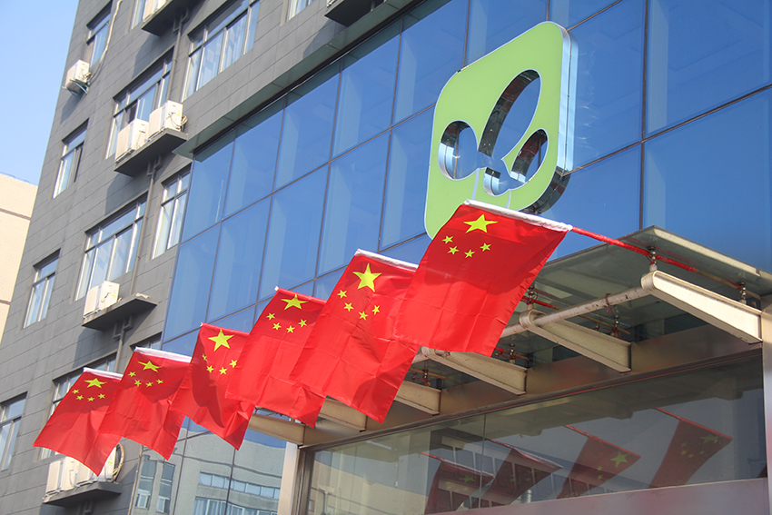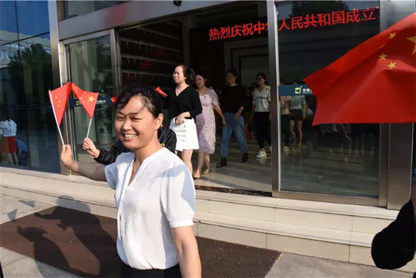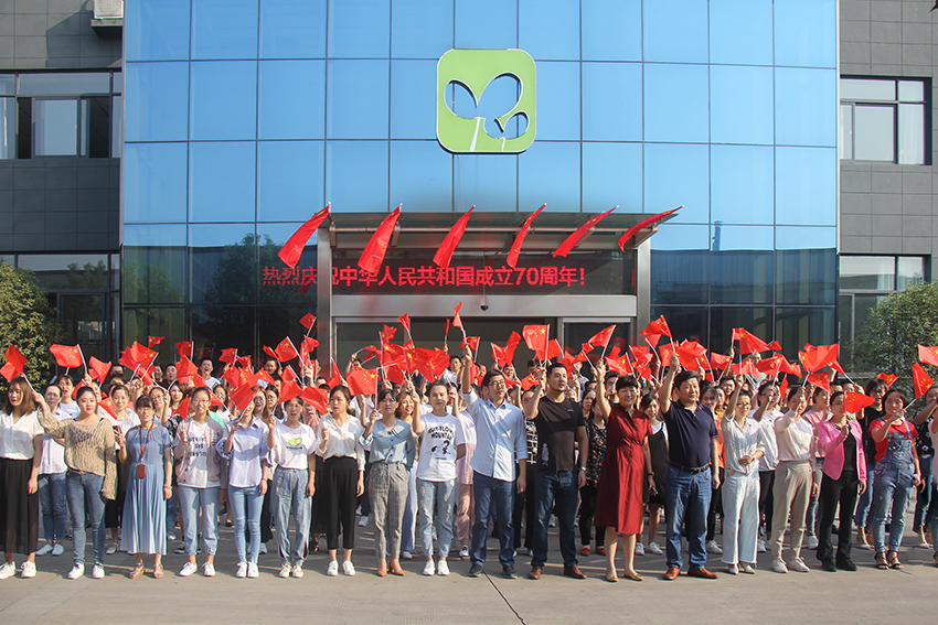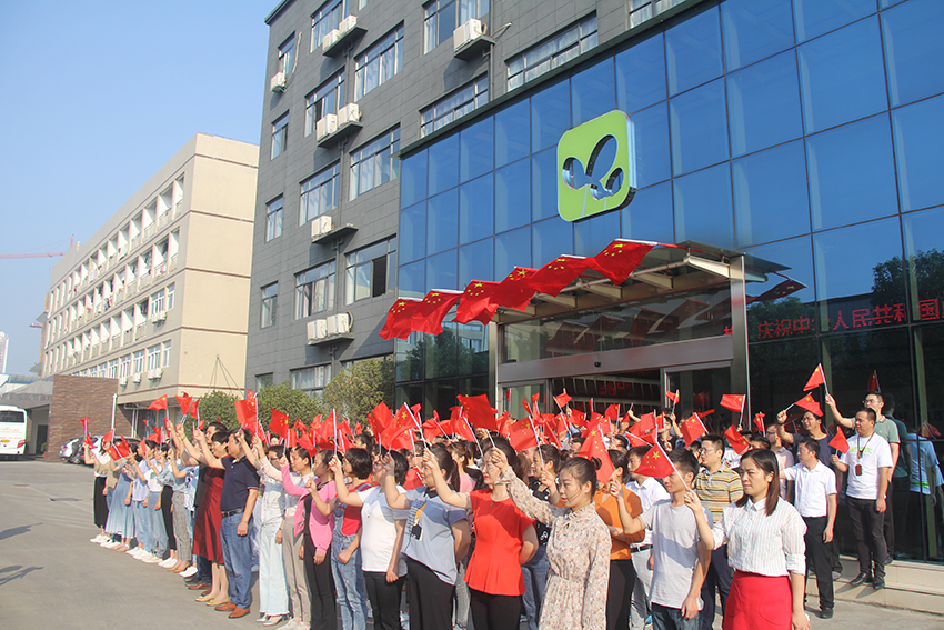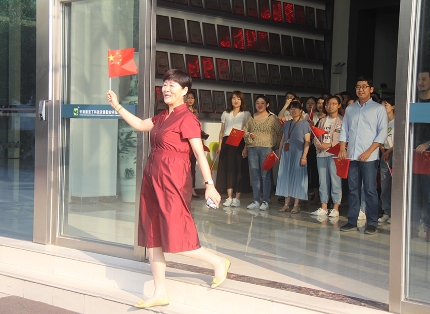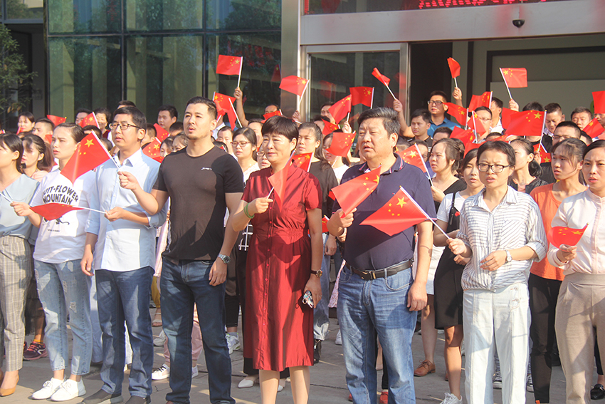 董事長張迎年帶領(lǐng)員工們舉旗高呼“我愛我的祖國”“我愛我的公司”“我愛我的家”